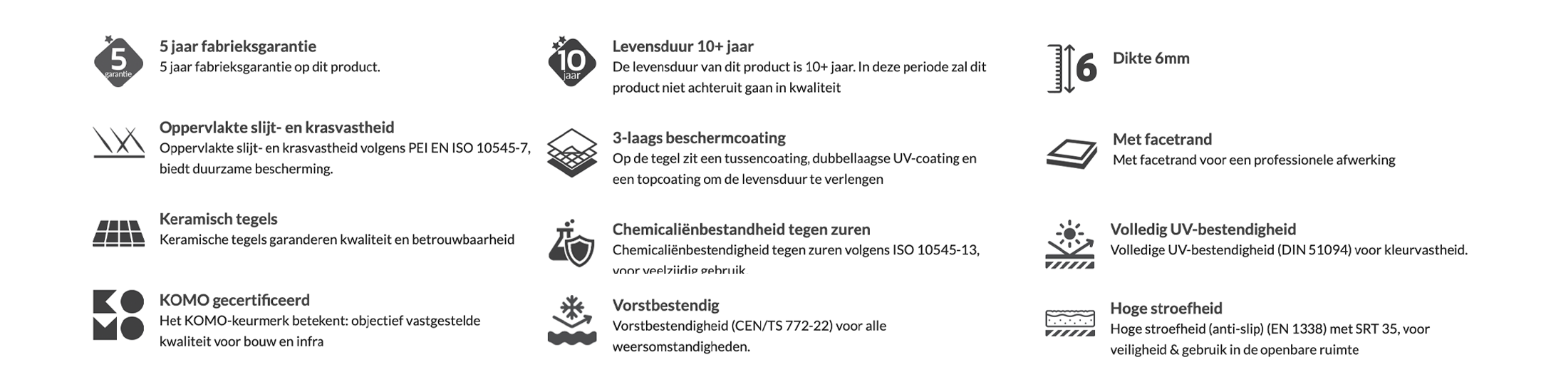 Elke tegel is voorzien van een slijtvaste opdruk met beschermende coating. Deze laag zorgt ervoor dat een tekst, afbeelding of symbool goed zichtbaar blijft. De gebruikte materialen zijn uv-bestendig en bestand tegen vorst. Dankzij een speciale afwerking hecht ijs zich bovendien minder snel aan het oppervlak. Hierdoor zijn de tegels veilig en duurzaam.